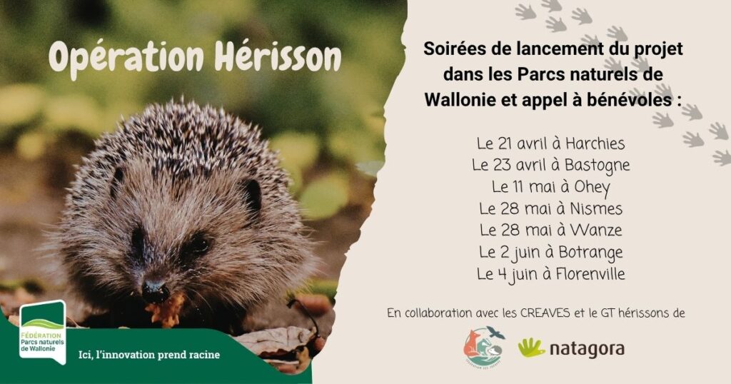 - 6 soirées de lancement organisées dans les Parcs naturels wallons pour accueillir de potentiels bénévoles, leur expliquer le projet, présenter le Groupe de Travail Hérissons de Natagora, fournir des informations utiles sur le recensement et l’encodage des données